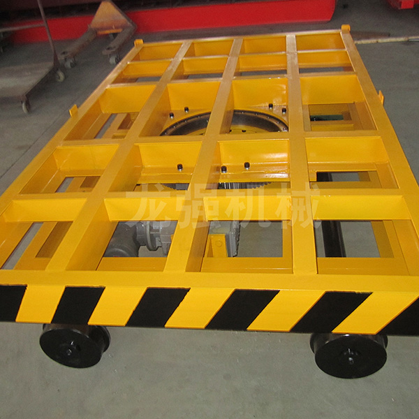 KPT系列電動平車由防爆電機(jī)連接減速機(jī)減速后,通過鏈輪鏈條旋轉(zhuǎn)而帶動電動平車滾輪在軌道上行走。電動平車運(yùn)行時,平臺下方固定連接坦克連一頭,另一頭固定在地平面的溝槽中,坦克連放平后厚度不會高出地平面,不會影響日常其他設(shè)備的運(yùn)作。電纜經(jīng)坦克鏈直接給電機(jī)供電。坦克鏈電纜的一端經(jīng)地面預(yù)埋管直接到控制柜中,另一端經(jīng)電動平車的固定裝置引入平車。該型電動平車的特點是臺面高度較低,裝卸重物容易,但運(yùn)行距離不能太長,一般不能超過50m,過長電纜重,坦克鏈會下垂。